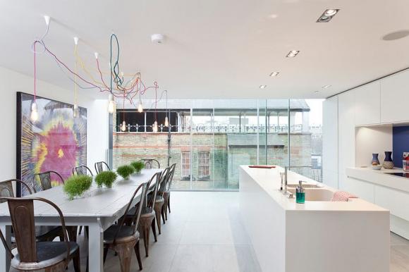 Những quả cầu kính đầy màu sắc đem hơi thở cuộc sống đến cho phòng ăn hiện đại.