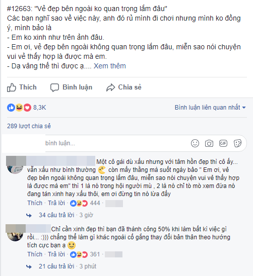- Em ơi, vẻ đẹp bên ngoài không quan trọng lắm đâu, miễn sao nói chuyện vui vẻ thấy hợp là được mà.