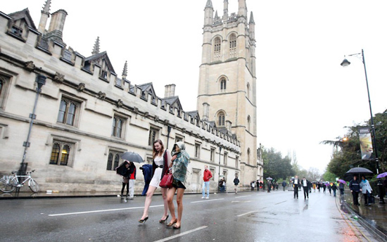 Sinh viên vượt trời mưa bên ngoài Trường Magdalen ở Oxford, Anh để tham dự hoạt động kỷ niệm Ngày Quốc tế Lao động.