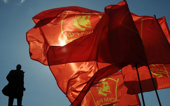 Lá cờ đỏ bay phấp phới gần bảng tàng Lenin ở thủ đô Moscow, Nga.
